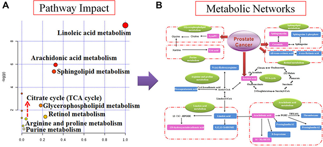 Figure 4: Pathway and metabolic networks analysis. (A) Pathway analysis with MetaboAnalyst tool; (B) Construction of the altered metabolic network associated prostate cancer model based on KEGG pathway database.