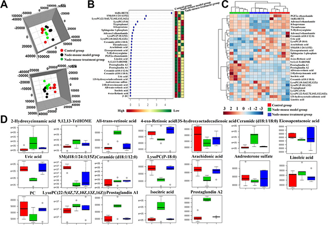 Figure 5: Serum metabolic profiling characterization and multivariate data analysis. (A) 3D score plots of OPLS-DA based on serum metabolites discriminating control group, nude-mouse model group and nude-mouse treatment group in both positive and negative mode; (B) VIP scores of the serum metabolite marker candidates; (C) The heatmap visualization for serum samples from the control, model group and treatment group; (D) Relative signal intensities of the serum metabolites identified by UPLC-Q/TOF-MS/MS.