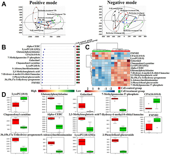 Figure 6: Cell metabolic profiling characterization and multivariate data analysis. (A) The PCA score plots of 22RV1 prostate cancer cells treatment of berberine at 12 h, 24 h, 36 h, 48 h and 72 h in both positive mode and negative mode; (B) VIP scores of the cell metabolite marker candidates; (C) The heatmap visualization for 22RV1 prostate cancer cell samples from the cell control group and cell treatment group; (D) Relative signal intensities of the cell metabolites identified by UPLC-Q/TOF-MS/MS.