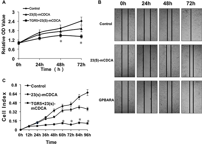 For detection of cell migration by in vitro scratch assay, HEK293 cells were cultured to confluent monolayers and then were treated with 23(S)-mCDCA (10 μM), GPBARA (3 μM) or vehicle (DMSO) for 24 hours, and then wounded by removing a 300–500 μm-wide strip of cells across the well with a standard 200 μL pipette tip. Wounded monolayers were washed twice to remove non-adherent cells. After indicated times of incubation, wound healing was recorded under a light microscopy.