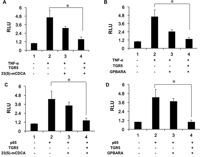 Figure 5: Activation of TGR5 antagonizes NF-κB transactivity. (A, B) TGR5 suppressed NF-κB transactivity induced by TNF-α. HEK293 cells were cotransfected with the NF-κB reporter plasmid (pNF-κB-LUC), phRL-TK, and TGR5 expression plasmid. After transfection, cells were treated with 23(S)-mCDCA (10 μM) (A), GPBARA (3 μM) (B) or vehicle (DMSO) for 24 hours and then treated with TNF-α (15 ng/mL) for 6 hours. (C, D) TGR5 suppressed NF-κB transactivity induced by p65 overexpression. HEK293 cells were cotransfected with the NF-κB reporter plasmid (pNF-κB-LUC), phRL-TK, and TGR5 and p65 expression plasmids. After transfection, cells were treated with 23(S)-mCDCA (10μM) (C), GPBARA (3 μM) (D) or vehicle (DMSO) for 24 hours. *P < 0.05. RLU, relative luciferase units. (n = 3).
