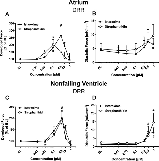 Figure 1: Inotropic effects of istaroxime and strophanthidin on human atrial and nonfailing ventricular myocardium. Comparable effects of istaroxime and strophanthidin on developed and diastolic force in human atrial (A–B) and nonfailing ventricular (C–D) myocardium. Data are represented as mean +/− SEM. (A) Dose response relationship (DRR) for strophanthidin (open circles; n = 13 trabeculae) and istaroxime (filled circles; n = 8 trabeculae). Effect on developed force: *= p < 0.05 vs. baseline (strophanthidin); # = p < 0.05 vs. baseline (istaroxime). (B) DRR for strophanthidin (open circles) and istaroxime (filled circles) with effect on diastolic force; # = p < 0.05 vs. baseline (istaroxime). (C) DRR for strophanthidin (open circles; n = 9 trabeculae) and istaroxime (filled circles; n = 9 trabeculae). Effect on developed force: * = p < 0.05 vs. baseline (strophanthidin); #= p < 0.05 vs. baseline (istaroxime). (D) DRR for strophanthidin (open circles) and istaroxime (filled circles) with effect on diastolic force: #= p < 0.05 vs. baseline (istaroxime).