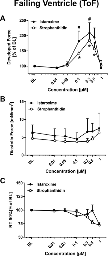 Istaroxime exerts stronger maximal positive inotropic effects than strophanthidin in failing myocardium (ToF)