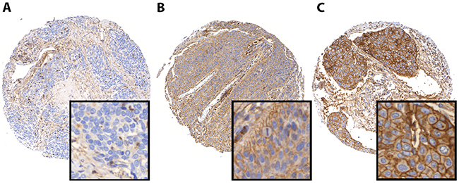 Figure 1: PD-L1 immunohistochemistry in HNSCC. Representative images of HNSCC demonstrating negative (A), low (B), and high (C) PD-L1 protein levels.