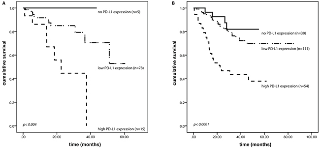 Statistical analyses were carried out using the SPSS 22 software package (IBM, Armonk, NY). PD-L1 protein expression was correlated with clinical-pathological data available using Chi-Square test or Pearson correlation. Overall survival time was defined as the time between first diagnosis and death of the patient or last clinical follow-up if the patient was still alive, respectively. Survival time was estimated by Kaplan-Meier analyses and compared among patient subsets using log-rank tests. Protein expression was also examined within univariate and multivariate Cox proportional hazards regression models. All statistical tests were two-sided. P-values <0.05 were considered to be statistically significant.