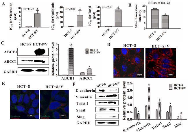 Figure 2: Effects of chemoresistance on the drug transporters and EMT. (A) IC50 values of HCT-8/V and parental HCT-8 cells for vincristine, taxol, and cisplatin; RI represents the resistance index. (B) Rh123 efflux was measured using flow cytometry. (C) Western blot analysis of ABCB1 and ABCC1; GAPDH was used as a loading control. (D) Increased actin microfilament was observed in the HCT-8/V cells by cytoskeleton staining. (E) Immunofluorescence staining of epithelial and mesenchymal markers in HCT-8 and HCT-8/V cells. Cells were double-stained for vimentin (red) and E-cadherin (green). Nuclei were counterstained blue with DAPI. (F) Expression of EMT markers and transcription factors was determined by Western blot. GAPDH was used as a loading control. Scale bars represent 10 μm in D and E. Data from three independent experiments were graphed as the mean ± SD. *P < 0.05.