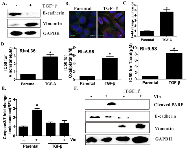 Figure 3: EMT induction by TGF-β is resistant to vincristine. (A) Western blot analysis showed that TGF-β induction resulted in EMT and exhibited a loss of E-cadherin and a gain in vimentin expression. (B) EMT acquisition by TGF-β induction was characterized by immunofluorescence. (C) TGF-β-treated cells increased the invasion capacity in the transwell assays. (D) The drug sensitivity of the TGF-β-treated cells decreased compared with that of the parental cells. (E) TGF-β-treated cells failed to exhibit the apoptotic characteristics of caspase-3/7 activation after vincristine exposure. (F) Western blot analysis showed the effect of vincristine (Vin: 80 nM) on PARP cleavage.