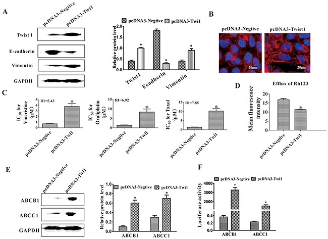 Figure 4: Ectopic expression of Twist1 induced EMT and MDR. (A) Expression levels of Twist1, E-cadherin, and vimentin were determined through Western blot. GAPDH was used as a loading control. *P < 0.05. (B) Increased actin microfilament was observed in the HCT-8-T cells through cytoskeleton staining. (C) IC50 values of HCT-8-C and HCT-8-T cells for vincristine, taxol, and cisplatin. RI represents the resistance index. (D) Efflux of Rh123 was measured using flow cytometry. (E) Western blot analysis of ABCB1 and ABCC1. GAPDH was used as a loading control. (F) Overexpressing Twist1 increased ABCB1 and ABCC1 promoter activities in the luciferase reporter assays. Scale bars represent 50 μm. Data from three independent experiments are graphed as the mean ± SD. *P < 0.05.