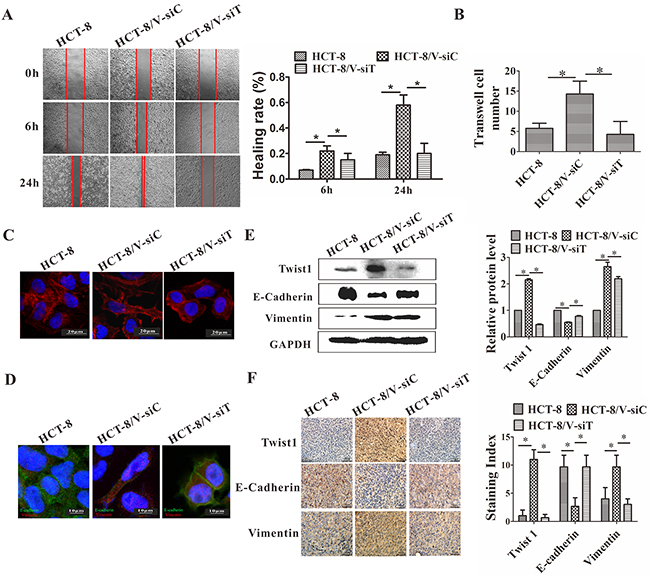 Figure 5: siRNA-mediated downregulation of Twist1 reversed EMT. (A) Healing rate was assayed at 6 and 24 h. The left panel shows representative images; the right panel shows quantitative analysis. (B) Number of cells invaded through basement member. (C) Twist1 silencing significantly decreased the number of actin microfilaments. (D) Immunofluorescence staining of E-cadherin and vimentin in the HCT-8/V cells following the downregulation of Twist1. Green corresponds to E-cadherin; red corresponds to vimentin. A blue signal represents nuclear DNA staining by DAPI. (E) Western blot analysis of E-cadherin and vimentin was performed on the HCT-8/V cells following the inhibition of Twist1. GAPDH was used as a loading control. The right panel shows the quantitative analysis of the relative protein levels. (F) IHC staining for E-cadherin and vimentin in the HCT-8 transplanted tumors. Representative images are shown in the left panel; the staining index is shown in the right panel. Scale bars represent 50 μm in D and F and 10 μm in C. Data from the three independent experiments are graphed as mean ± SD. *P < 0.05.