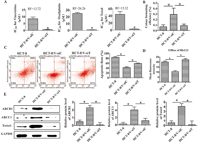 Figure 6: Downregulation of Twist1 reversed MDR in vitro. (A) IC50 values for vincristine, taxol, and cisplatin. (B) Proliferating abilities of the HCT-8/V and HCT-8 cells were determined by colony formation assay. (C) Analysis on cell apoptosis by flow cytometry; the quantitative analysis is shown in the right panel. (D) Efflux of Rh123 was measured using flow cytometry. (E) ABCB1, ABCC1 and Twist1 expression levels. The right panel shows the relative protein level. The expression levels of Twist1 and ABCB1/ABCC1 were upregulated in the HCT-8/V cell line compared with those in the HCT-8 parental cells. Twist1 silencing decreased the ABCB1 and ABCC1 expression levels in HCT-8/V cells. Data from three independent experiments are graphed as mean ± SD. *P < 0.05.