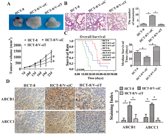 Figure 7: Downregulation of Twist1 increased the chemosensitivity of HCT-8 transplanted tumor to vincristine in vivo. (A) Effects on the tumor growth rate. The left panel shows the representative images of tumors harvested at the end of the experiments; the right panel shows the curve of the xenograft growth. (B) Metastases in lung tissues of the tumor-bearing model. The left panel shows the representative images of lung tissues stained with H&E; the right panel shows the number of metastases in lung tissues. The scale bars represent 100 μm. (C) Overall survival analyses in mice treated with Twist1-siRNA or control siRNA followed by vincristine treatment (P = 0.000). (D) Immunohistochemical staining for ABCB1 and ABCC1 in tumors. Representative images are shown in the left panel; the staining index is shown in the right panel. Scale bars = 50 μm. Data from three independent experiments are graphed as mean ± SD. *P < 0.05.