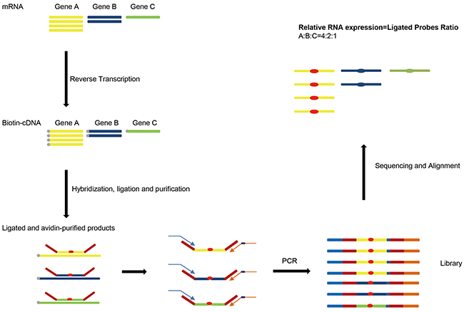 Figure 1: The principle of RT-MLPSeq. First RNA from samples were reverse transcribed into cDNA. Probe pairs targeting on different genes were then hybridized to cDNA and ligated by DNA ligase. After PCR with adaptor primers RT-MLPSeq Libraries were prepared and sequenced. Finally relative RNA expression levels of different genes were determined by the ratio of number of corresponding reads.