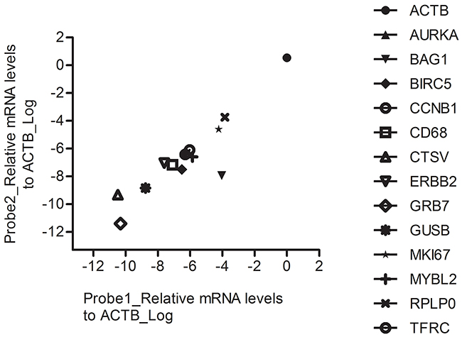 Next we tested the reproducibility of different RT-MLPSeq probes targeting the sample transcripts. To achieve this object, we designed two different probe pairs for each 14 genes, including ACTB, AURKA, BAG1, BIRC5, CCNB1, CD68, CTSV, ERBB2, GRB7, GUSB, MKI67, MYBL2, RPLPO and TFRC. As illustrated in Figure 3, different probe pairs that target the same transcripts showed similar relative levels in A549 cancer cell line.