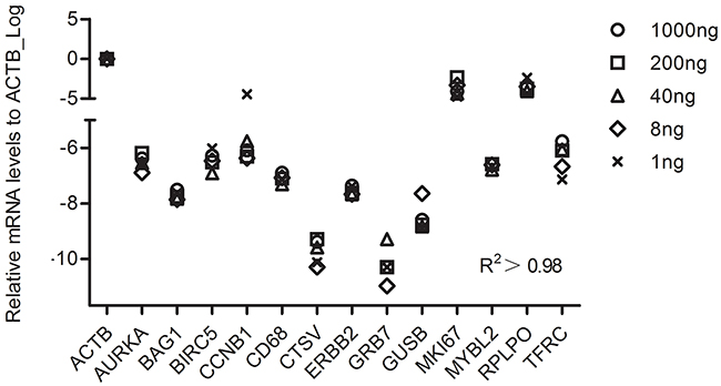 To identity the least RNA needed for the RT-MLPSeq, we performed experiments with starting RNA input from 1 ng to 1 ug. 30 cycles were adopted during the PCR process for the RNA input less than 8 ng and 25 cycles for others. As shown in Figure 4, all the 13 target genes had similar relative expression levels among all the assays with different RNA inputs. Pearson’s correlation analysis showed that results from different RNA input were highly relevant (R2>0.98).