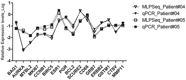 Figure 5: The RNA expression levels of 16 cancer-associated genes in patient #04 and #05 detected by both RT-MLPSeq and RT-qPCT methods. The RNA levels of 16 genes, including Ki67, STK15, Survivin, CCNB1, MYBL2, GRB7, HER2, MMP11, CTSL2, ER, PGR, BCL2, SCUBE2, GSTM1, CD68, BAG1 in FFPE sections were normalized to the average Ct value of 5 reference genes (ACTB, GAPDH, RPLPO, GUSB, TFRC).