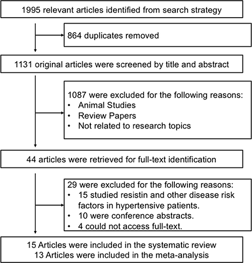 The database search originally resulted in retrieval of 1995 articles related the search keywords. The flow diagram of the study selection process is presented in Figure 1. Finally, 15 articles were included in the systematic review and 13 articles containing 14 case-control studies were enrolled in the meta-analysis [14–26]. The major discovery of the two studies that are excluded from the meta-analysis were summarized in Supplementary Table 2. The publication year of these studies ranged between 2003 and 2013. All articles were case-control studies reporting the relationship between serum resistin levels and hypertension in European, Asian and Hispanic populations. Table 1 displays the basic features of the studies and the detection kits used in each study. The available clinical characteristics of the enrolled studies are summarized in Table 2.