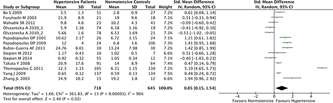In our analysis, fourteen case-control studies investigating the correlation between serum resistin concentration and hypertension were included. Ten of those studies reported higher resistin level in the hypertension patients, and seven of them were statistically significant. Collectively, our meta-analysis showed that resistin concentration of hypertensive patients was significantly higher than that of normal controls (SMD [95% CI], 0.85 [0.15, 1.54]), indicating that resistin might be a potential risk factor and biomarker for hypertensive patients.