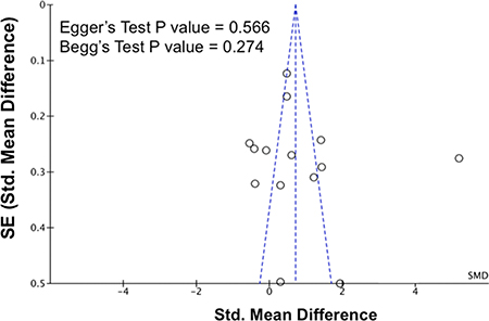 Figure 6: Publication biases on the differences of serum resistin levels between hypertensive and normotensive individuals. The P values for Egger’s test and Begg’s test are shown in the figure. Abbreviations: 95% CI, 95% confidence interval; SE, standard error.