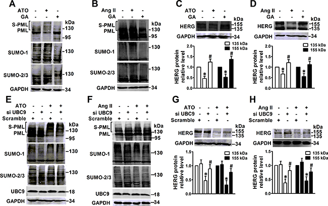 Figure 3: Effect of interference with PML SUMOylation by GA or UBC9 knockdown on HERG expression. PML and SUMO molecules were analyzed by immunoblot using whole lysates from NMCMs. The cells were pretreated with GA (50 μM) for 4 h, then treated with (A) ATO (2 μM) for 2 h or (B) Ang II (100 nM) for 4 h. Immunoblot analysis of HERG protein and quantitative densitometric analysis in the whole lysates from NMCMs. The cells were pretreated with GA (50 μM) for 4 h, then treated with (C) ATO (2 μM) or (D) Ang II (100 nM) for 24 h. Immunoblot analysis PML, SUMO-1, SUMO-2/3, and UBC9 expression in UBC9-silencing NMCMs treated with (E) ATO (2 μM) for 2 h or (F) Ang II (100 nM) for 4 h. Immunoblot analysis of HERG expression and quantitative densitometric analysis in NMCMs treated with (G) ATO (2 μM) or (H) Ang II (100 nM) for 24 h after UBC9 knockdown. The protein molecular mass is given in kDa and shown in the right panel. The high-molecular-weight bands (> 130 kDa) in parentheses indicate SUMOylated PML (S-PML). The data shown in Figures A–H are representative of three separate experiments. The data represent the mean ± SEM normalized with control (Ctrl) of three separate experiments. *P < 0.05 versus control group, #P < 0.05 versus scramble + ATO or scramble + Ang II group.