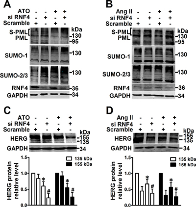 In order to regain PML SUMOylation, RNF4, a RING-finger ubiquitin ligase implicated in arsenic-induced PML degradation via the ubiquitin-proteasome [11], was knocked down in NMCMs. Bands were observed via immunoblotting that were consistent with SUMOylated PML after ATO and Ang II treatment and RNF4 depletion caused a shift in endogenous SUMO conjugates that were consistent with global SUMO expression (Figure 4A, 4B). Less HERG protein expression was noted in NMCMs subjected to RNF4 silencing than in those exposed to ATO (Figure 4C) or Ang II (Figure 4D).