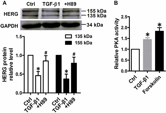 Figure 6: HERG protein expression inhibition by TGF-β1 stimulation dependent of PKA activity. (A) Immunoblot analysis of HERG protein expression inhibition by TGF-β1 in NMCMs. Cells were treated with TGF-β1 (5 ng/mL) for 24 h or co-treated with H89 (10 mM) and TGF-β1 (5 ng/mL). The results of quantitative densitometric analysis results are shown in the lower panel. (B) PKA activity was measured in NMCMs using a kit with TGF-β1 (5 ng/mL) for 24 h or with TGF-β1 and forskolin (10 μM). The data represent the mean ± SEM normalized with GAPDH of three separate experiments. *P < 0.05 versus control group, #P < 0.05 versus TGF-β1 group.