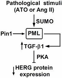 Figure 7: Putative mechanism of PML on HERG protein expression. Stimulation of ATO and Ang II increased the SUMO conjugation with PML, as well as NBs formation. PML-NBs promoted the sequestration of Pin1 into PML-NBs and then upregulated TGF-β1 expression, leading to downregulation of HERG via PKA.