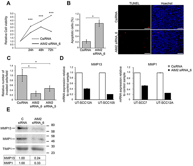 Figure 4: Knockdown of AIM2 inhibits viability and invasion of cSCC cells. (A) The number of viable cSCC cells (UT-SCC7) was determined 24, 48, and 72 hours after transfection with AIM2 siRNA_6 and control siRNA (CSiRNA) (75 nM) (mean ± SD, n=8). (B) cSCC cells (UT-SCC7) were transfected with AIM2 siRNA_6, or control siRNA and 48 hours after transfection apoptotic cells were detected with TUNEL staining and the relative number of TUNEL positive apoptotic cells with positive nuclear staining was determined by counting 2000-3000 cells at 10× magnification per image (n=3, mean ± SD) (left panel). Representative images of the quantification are shown. Scale bar=100 μm (right panel). (C) UT-SCC7 cell lines were transfected with AIM2 or control siRNAs and seeded to the inserts coated with type I collagen 24 hours after transfection. After 48 hours the number of invaded cells was counted (mean ± SD, n=3). (D) MMP13 and MMP1 mRNA levels were determined by qRT-PCR 72 hours after AIM2 knockdown in cSCC cells. (E) Levels of MMP13 and MMP1 in conditioned media of cSCC cells (UT-SCC12A) were determined by Western blot analysis 72 hours after AIM2 knockdown. TIMP1 was used as a marker for equal loading. Levels of MMP1 and MMP13 were quantitated by densitometry and corrected for the level of TIMP1. (*P<0.05, ***P<0.001; Student’s t-test).