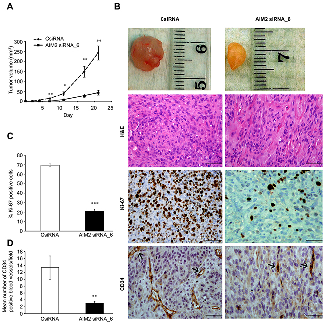 Figure 5: AIM2 knockdown suppresses growth and vascularization of human cSCC xenografts. (A) cSCC cells (UT-SCC7) were transfected with AIM2 siRNA_6 or control siRNA (75 nM). 72 hours after transfection, cells (5×106) were injected subcutaneously into the back of SCID mice (n=8 for each group) and the size of tumors was measured twice a week (mean ± SEM). (B) Tumors were harvested after 21 days, embedded in paraffin and stained with H&E (upper panels), for proliferation marker Ki-67 (middle panels), and for vascular endothelial marker CD34 (lower panels). (C) The percentages of Ki-67-positive tumor cells in xenografts were counted (mean ± SEM). (D) The density of CD34-positive blood vessels in xenografts was determined in each tumor. Scale bar=100μm (*P<0.05, **P<0.01, ***P<0.001; Student’s t-test).