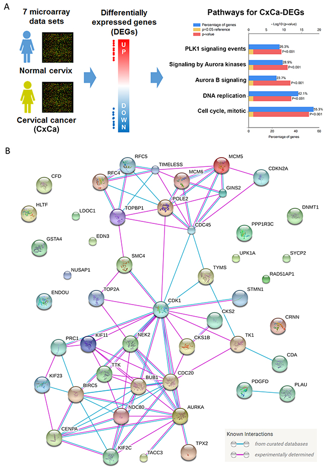 It is well known that cell cycle dysregulation is the major hallmark of many cancer types [19]. Therefore, we hypothesized that inhibition of cell cycle progression-related genes by IFNγ could provide clinical benefits through the reversal of the cancer hallmark. To demonstrate this, a microarray analysis of human cervical cancer tissues was performed (Figure 2A). Seven microarray data sets (Table 1 [20–25]) from healthy donors and patients with cervical cancer were obtained from the NCBI-GEO database. As expected, the majority of these cohorts were SCC cases. Next, the differentially expressed genes (DEGs; listed in Supplementary Table 2) of each data set were prepared by the GEO2R, an R-based web application used to analyze GEO data [12]. We identified 38 upregulated and 10 downregulated genes that were common in cancerous cervical tissues (Table 2). These cervical cancer DEGs (CxCa-DEGs) were then analyzed for biological pathway enrichment using the FunRich software. As shown in Figure 2A, gene alterations related to cell cycle progression (DNA replication and cell cycle, mitotic) and upstream kinases (PLK1 and Aurora kinases) were found. The parallel of biological pathways altered between CxCa-DEGs and IFNγ-downregulated genes (Figures 1B and 2A) may imply the clinical benefit of IFNγ-based therapy through targeting cell cycle deregulation of cervical cancer.