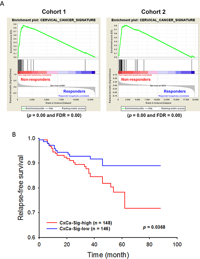 To establish a gene signature of cervical cancer for further analyses, the network of CxCa-DEGs was reconstructed by the Search Tool for the Retrieval of Interacting Genes/Proteins (STRING) database that can provide the assessment and integration of protein-protein interactions, including direct (physical) and indirect (functional) associations [27]. As shown in Figure 2B, the major network consisted of 32 upregulated genes and one downregulated gene (listed in Table 2), and was designated as a cervical cancer signature (CxCa-Sig). Clustering analysis and heat map visualization showed that CxCa-Sig was consecutively altered during the cervical cancer progression from normal epithelium, to intraepithelial lesion, to invasive carcinoma in two data sets (Figure 4A: GSE7803 [20]; Figure 4B: GSE63514 [22]) of cervical SCC patient cohorts. In addition, GSEA was performed to test whether the expression of CxCa-Sig was associated with clinical outcome. Two cohorts of cervical SCC patients were used, which contained responders and non-responders to neoadjuvant chemotherapy using nedaplatin and irinotecan before surgery (cohort 1, GSE70035 [28]), and chemoradiotherapy using cisplatin with or without surgery (cohort 2, GSE56363 [29]). As shown in the enrichment plot (Figure 5A) and the heat map (Supplementary Figure 3), CxCa-Sig was enriched in non-responders in both cohorts (p value = 0.00 and FDR = 0.00), indicating that cervical cancer patients with lower expression of CxCa-Sig respond better to therapy. Furthermore, Kaplan-Meier (KM) survival analysis using the PROGgeneV2 prognostic database [30] demonstrated that higher expression of CxCa-Sig was associated with shorter relapsed-free survival (Figure 5B). These results suggest that CxCa-Sig was associated with poor clinical outcomes.