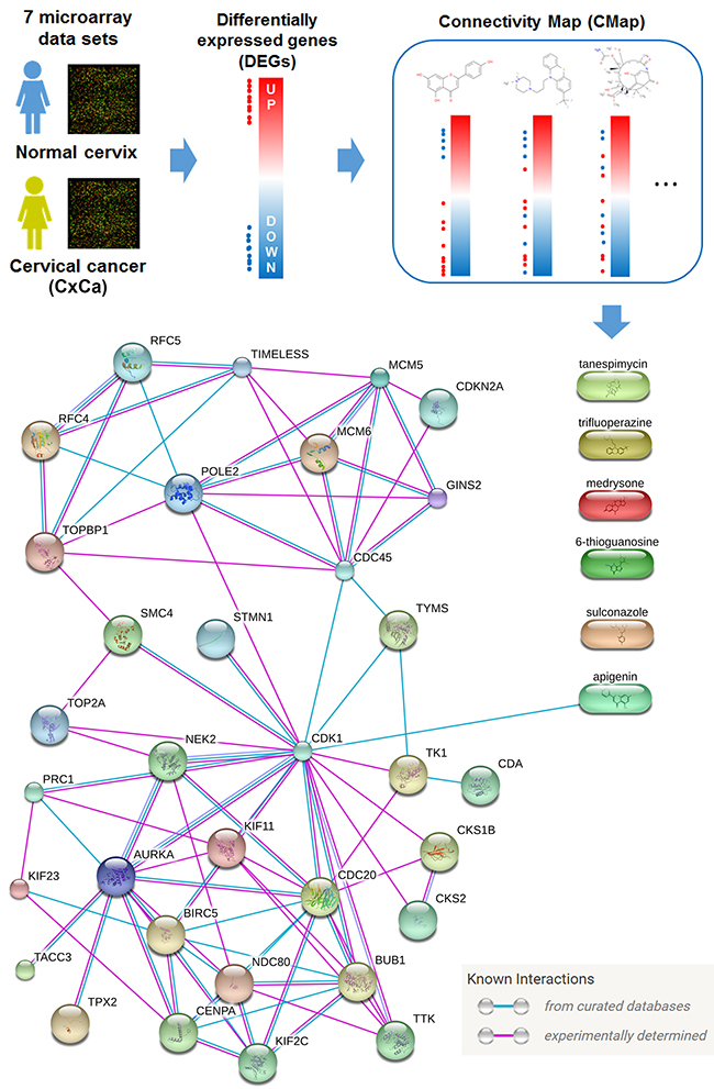 Figure 7: Identification of apigenin as an anticancer agent for cervical cancer. Upper part: DEGs obtained from cervical cancerous v.s. normal tissues were queried using the CMap database for potential anticancer agents against cervical cancer. Lower part: Six candidate compounds were further analyzed by the STITCH database for their connectivity to CxCa-Sig.