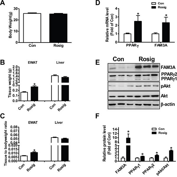 Figure 1: Rosiglitazone administration upregulated FAM3A expression in adipose tissues of C57BL/6 mice. 8-10 week old C57BL/6 mice fed on normal diet were orally administrated with rosiglitazone for 1 month. (A-C) Rosiglitazone administration on bodyweight (A), epididymal white adipose tissue (EWAT) and liver weight (B), and tissue weight/bodyweight ratios (C). (D) Rosiglitazone administration on the mRNA levels of PPARγ and FAM3A in adipose tissues. The primer for PPARγ mRNA analysis detected both PPARγ1 and PPARγ2 mRNA in adipose tissues in this study. (E, F) Rosiglitazone administration on the protein levels of PPARγ and FAM3A in adipose tissues. Representative gel images were shown in (E), and quantitative data shown in (F). Con: control mice treated with saline; Rosig: experiment mice treated with rosiglitazone. N=6-8 for protein assays, N=12-14 for mRNA assays, *p<0.05 versus control mice.