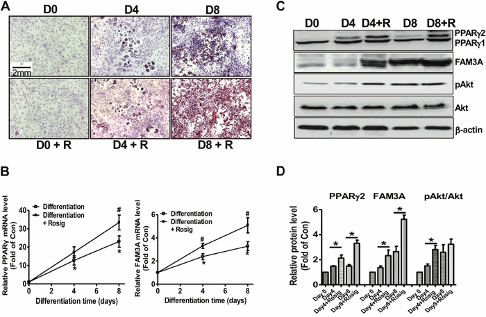 Figure 2: FAM3A expression was increased in differentiated 3T3-L1 preadipocytes. (A) Representative images of differentiated 3T3-L1 cells with Oil Red O staining. The magnification power is 100. (B) The mRNA levels of PPARγ and FAM3A during differentiation of 3T3-L1 cells. The primer for PPARγ mRNA analysis detected both PPARγ1 and PPARγ2 mRNA in 3T3-L1 cells in this study. (C, D) The protein levels of PPARγ and FAM3A during differentiation of 3T3-L1 cells. Representative gel images were shown in (C), and quantitative data shown in (D). D0, D4, and D8 represented 0 day, 4 days and 8 days after induction of differentiation, respectively; R, in the presence of rosiglitazone. N=5-8, *p<0.05 versus D0 or control, #p<0.05 versus differentiation group without rosiglitazone at the corresponding time point.