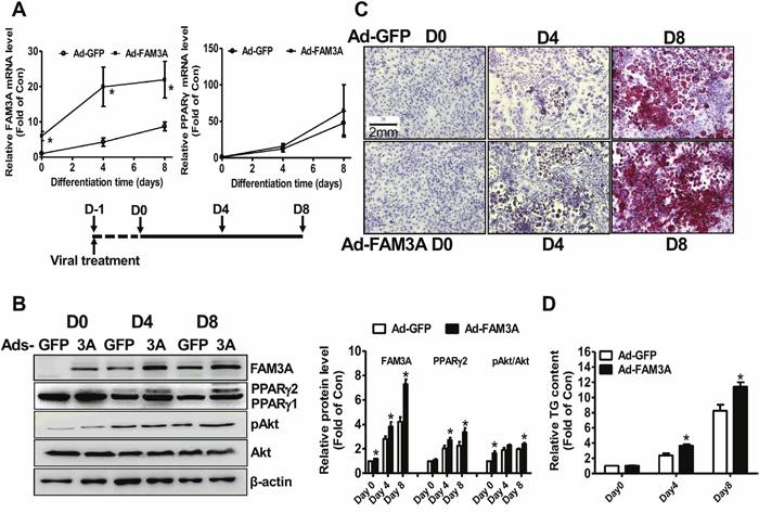 Figure 4: FAM3A overexpression enhanced the differentiation of 3T3-L1 preadipocytes. (A) Ad-FAM3A treatment on the mRNA levels of FAM3A and PPARγ in 3T3-L1 cells. (B) Ad-FAM3A treatment on the protein levels of FAM3A and PPARγ in 3T3-L1 cells. Representative gel images were shown in left panel, and quantitative data shown in right panel. (C) Representative images of differentiated 3T3-L1 cells with Oil Red O staining after Ad-FAM3A or Ad-GFP treatment. (D) Quantitative analysis of TG levels in differentiated 3T3-L1 cells. N=5-8, *p<0.05 versus control groups treated with Ad-GFP at the corresponding time point.