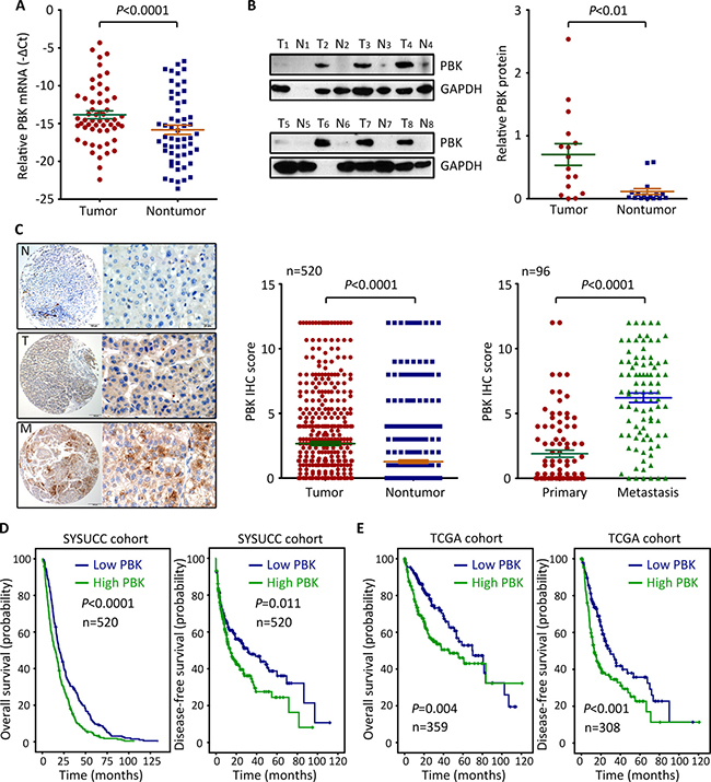 Figure 1: PBK expression is up-regulated in HCC and associated with poor outcomes. (A) The expression of PBK mRNA in 56 pairs of HCC specimens was determined by qRT-PCR. (B) PBK protein level was evaluated in 16 HCC cases by western blot. The representative images (left panel) and the statistics (right panel) were presented. (C) PBK expression was examined 520 paired HCC and nontumorous tissues and 96 paired HCC and metastatic tissues by immunohistochemistry (IHC). The IHC score of PBK was shown and compared. (D, E) Kaplan-Meier analyses was conducted to assess the value of PBK in overall and disease-free survivals of patients with HCC in our and TCGA cohorts.