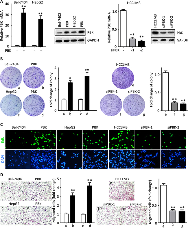 Figure 2: PBK promotes HCC cell proliferation and migration in vitro. (A) PBK mRNA and protein expressions were determined in Bel-7404 and HepG2 cells transfected with either PBK plasmid for 36 h or PBK siRNAs for 36 h. (B) Colony formations assays were performed, using cells with PBK overexpression or knockdown. (C) The cell proliferation was determined by EdU staining. (D) Transwell assays were used to assess the effect of PBK on cell migration. **P < 0.01.