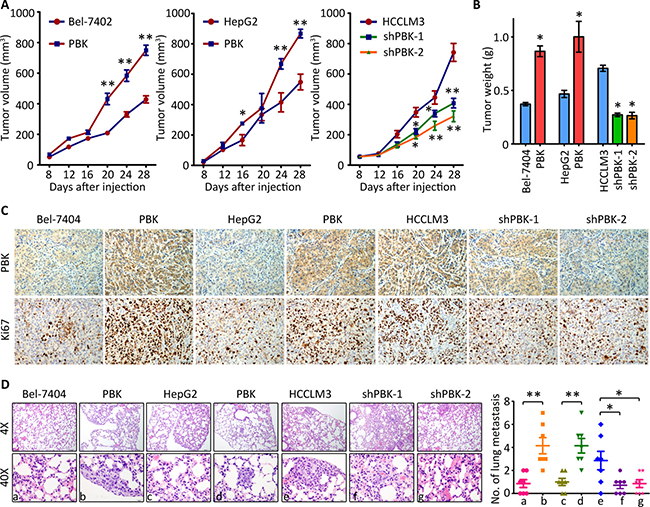 Figure 3: PBK enhances tumor growth and metastasis in vivo. (A) HCC cells were injected into the left flank of the mice. The tumor volumes were measured every 3 days. The growth curve was recorded. (B) At day 28 after injection, tumors were resected and weighted. (C) The paraffin-embedded tumors were sectioned and stained with PBK and Ki67. (D) Cells were injected into the tail vein. After 40 days, the lungs were dissected and stained with HE. The metastatic nodules were counted under a microscope and indicated. All *P < 0.05, **P < 0.01.