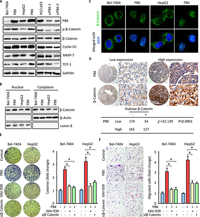 Figure 4: PBK exerts oncogenic activities by activating β-Catenin signaling pathway. (A) HCC cells were transfected with PBK overexpression vector or siRNAs for 36 h. The expressions of phophorylated-β-Catenin, Cyclin D1, MMP-7 and TCF-1 were examined by western blot. GAPDH was served as loading control. (B) The cells treated as described in A were fractioned into nuclear and cytoplasm. The level of β-Catenin was determined. (C) Immunofluoresence was performed to indicate the cellular localization of β-Catenin in cells with PBK overexpression. (D) The representative images of PBK and β-Catenin IHC staining were presented (top panel). The correlation between PBK and β-Catenin expression in HCC tissues was determined and shown (bottom panel). (E, F). Cells with CBX8 overexpression were treated with either β-Catenin siRNA or its inhibitor XAV-939. Colony formation (E) and Transwell assays (F) were performed to evaluate the effect of inhibition of β-Catenin on the CBX8-promoted cell proliferation and migration. The fold changes were indicated by histogram. All *P < 0.05.