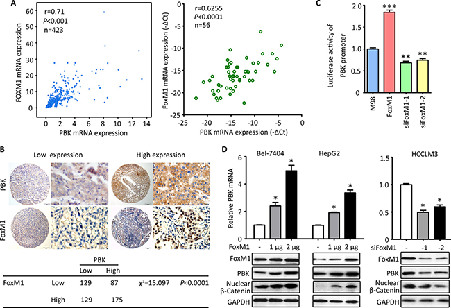 Figure 5: PBK is transcriptionally regulated by FoxM1. (A) The correlation of PBK and FoxM1 mRNA expression was determined in 423 cases in TCGA cohort (left panel) and 56 cases in our cohort (right panel). (B) The representative images of PBK and FoxM1 IHC staining were presented (top panel). The correlation between PBK and FoxM1 expression in 520 HCC tissues was determined and shown (bottom panel). (C) Luciferase assays were performed to effect of FoxM1 overexpression or knockdown on the activity of PBK promoter in Bel-7404 cells. (D) The effect of FoxM1 overexpression or knockdown on PBK expression was determined in HCC cells. All *P < 0.05, **P < 0.01.