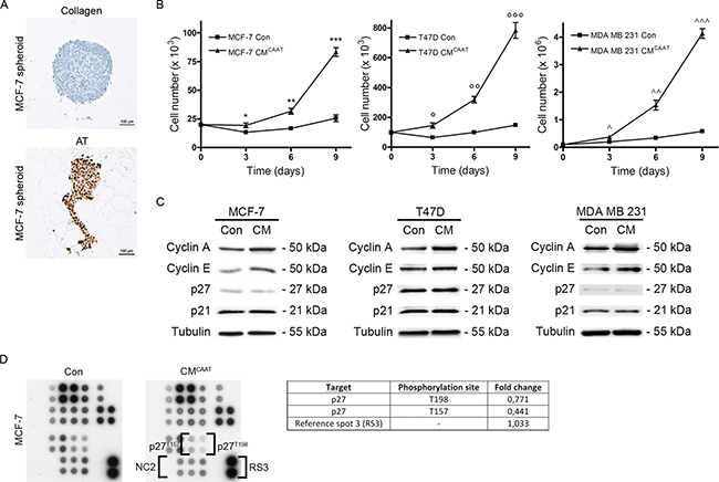 Figure 2: CAAT stimulates proliferation of breast cancer cells. (A) Ki67 staining of MCF-7 spheroids cultured in CAAT or collagen type I (SC is 100μm). (B) graphs representing proliferation tests of MCF-7, T47D or MDA MB 231 cells treated with control medium (Con) or CMCAAT; *p = 0.0989, **p = 0.0093, ***p = 0.0003, °p = 0.0187, °°p = 0.0007, °°°p = 0.0003, ^p = 0.0327, ^^p = 0.0093, ^^p = 0.0001. (C) Western blot analysis of cyclin A, cyclin E, p27 and P21 in MCF-7, T47D or MDA MB 231 cells treated for 48 h with Con or CMCAAT, tubulin serves as internal control. The image shows the results of 1 of 3 repeats (n = 3) with each time 3 biological repeats. (D) phospho kinase array (part B) indicating phosphorylation levels of p27 in MCF-7 cells treated for 48 h with Con or CMCAAT, NC = negative control (Of note, NC1, RS1 and RS2 are shown in part A of the phospho kinase array displayed in Figure 2A of our previous publication [12]).