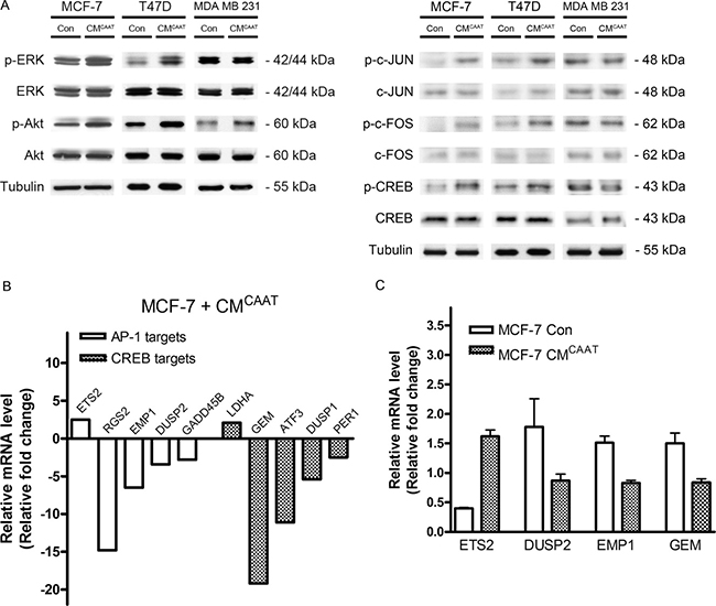 Figure 3: CAAT enhanced breast cancer proliferation correlates with differential activation of AP-1 and CREB dependent genes. (A) Western blot analysis of (p-)Erk, (p-)Akt, (p-)c-JUN, (p-)c-FOS and (p-)CREB in MCF-7, T47D and MDA MB 231 cells treated for 48 h with Con or CMCAAT. (B) relative fold change of indicated AP-1 and CREB genes in MCF-7 cells treated for 48 h with CMCAAT compared to control. (C) relative mRNA levels of indicated genes in MCF-7 cells treated for 48 h with Con or CMCAAT.