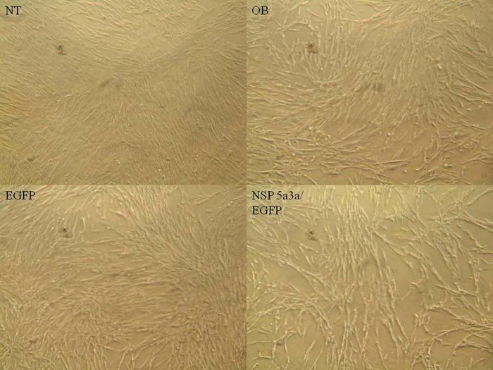 Figure 3: Morphological observation of WI38 cells 3 days post-transfection. NT: non-treated, OB: only buffer, EGFP: only pcDNA3.1/CT-GFP vector, NSP 5a3a/EGFP: pcDNA 3.1/CT-GFP and pcDNA 3.0 NSP 5a3a.
