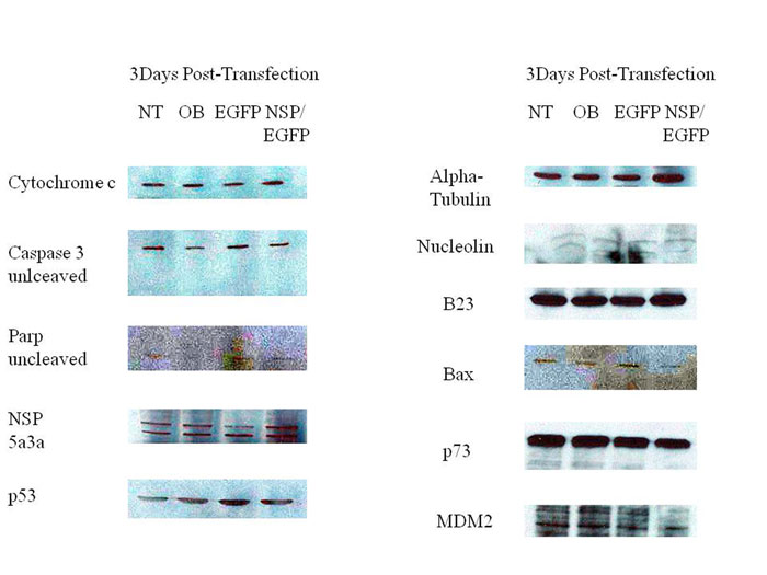 Western blot analysis of total lysates of WI38 cells from three days post-transfection along with controls were analyzed to elucidate the possible pathway that NSP 5a3a may be affecting in order to induce apoptosis again in this particular p53 functional cell line [29].