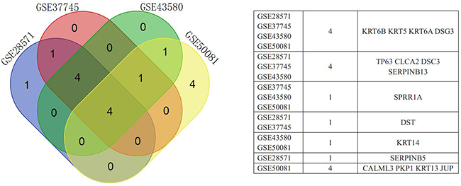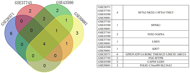 Using GCBI, we identified 243, 210, 118, and 101 potential DEGs from GSE28571, GSE37745, GSE43580, and GSE50081, respectively (Figure 2, Supplementary Table 1–4). Removal of duplicate genes and expression values lacking specific gene symbols left 176 DEGs from GSE28571 (Supplementary Table 5), 153 from GSE37745 (Supplementary Table 6), 81 from GSE43580 (Supplementary Table 7) and 71 from GSE50081 (Supplementary Table 8).