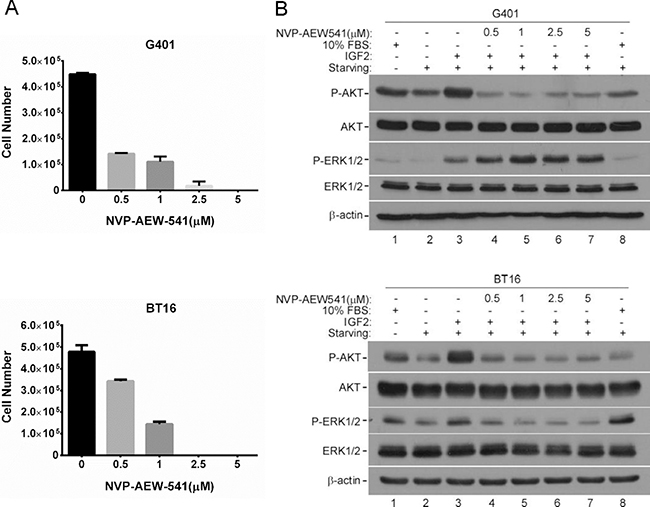 Figure 4: IGF2 activated downstream signaling mainly through IGF1R. (A) IGF1R inhibitor NVP-AEW541 blocked the proliferations of G401 and BT16 cell lines. G401 and BT16 cells were cultured in α/Ham medium supplemented with 10% FBS containing DMSO or NVP-AEW541 at indicated concentrations (0.5, 1, 2.5, 5 μM). Triplicate dishes were counted in a haemocytometer at Day 3. Each point is represented as the mean ± SD. (B) Activities of downstream signaling in G401 and BT16 cells upon the treatment of NVP-AEW541 in absence or presence of IGF2. Cells were starved for 12 h, and medium was changed again 2 hours before stimulation. Vehicle control DMSO or IGF1R inhibitor NVP-AEW541 (0.5, 1, 2.5, 5 μM) was added 1 hour before rhIGF2 stimulation. Then G401 and BT16 cell lines were treated with 200 ng/ml rhIGF-2 or 10% FBS under serum-free conditions for 15mins. Activation of AKT and ERK1/2 were detected by western blot analysis. β-actin served as a loading control. A representative example from 3 independent experiments is shown.