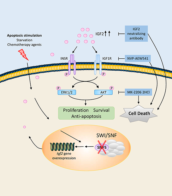 Figure 6: Schematic illustration of IGF2 axis, downstream kinase pathways, potential therapeutic targets in MRT cells. In the SNF5/INI1/SMARCB1/BAF47 deficient MRT cells, IGF2 was upregulated when cells suffer from microenvironmental stress including serum deprivation and chemotherapeutic agent exposure. The autocrine IGF2 in turn activated intracellular PI3K/AKT and RAS/ERK pathways through IGF1R and INSR. These two pathways further contribute to survival, proliferation and anti-apoptosis of the tumor cells. Inhibiting this pathway, including IGF2 neutralizing antibody, IGF1R inhibitor NVP-AEW541 and AKT inhibitor MK-2206 2HCl, effectively abolished the ability of the tumor cells to grow in vitro.