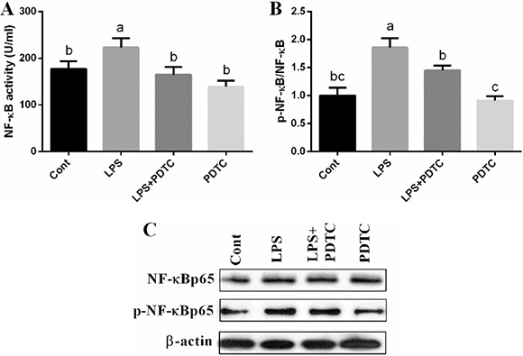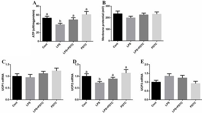 Mitochondrial function (ATP synthesis and membrane potential) was evaluated (Figure 6) and the results showed that LPS markedly induced mitochondrial dysfunction via inhibiting ATP synthesis (p < 0.05), while PDTC alleviated the mitochondrial dysfunction (p < 0.05).
