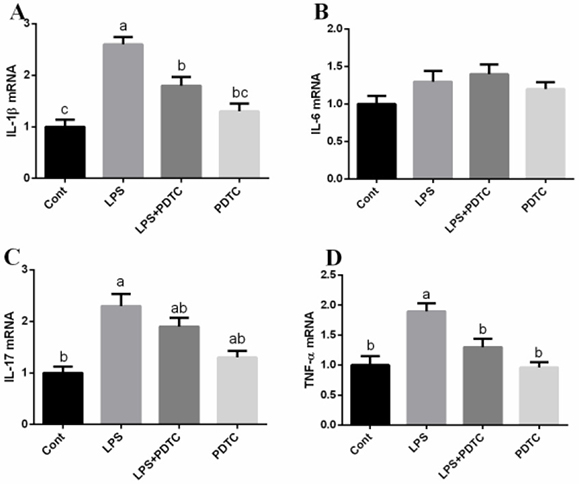 Expressions of IL-1β, IL-6, IL-17, and TNF-α in the lung were further tested via RT-PCR (Figure 4). The results showed that LPS exposure upregulated IL-1β, IL-17, and TNF-α expression (p < 0.05) and PDTC alleviated LPS-induced generation of L-1β and TNF-α (p < 0.05).