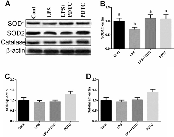 Expressions of superoxide dismutase 1 (SOD1), SOD2, and catalase in the lung after LPS exposure were further determined via western blot (Figure 5). The results showed that LPS inhibited SOD1 expression and PDTC markedly enhanced SOD1 abundance in the lung (p < 0.05). Although PDTC tended to upregulated SOD2 and catalase expressions, the differences were insignificant (p > 0.05).
