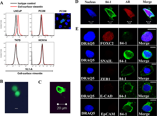 We previously reported a method for isolating mesenchymal CTCs from sarcoma and CSV-CTCs from colon cancer patient blood samples [15, 17] and characterized the method in detail describing the sensitivity and specificity of CTC isolation along with validation studies. To determine whether PCA express CSV, we tested LNCaP, PC3M, T47D and HCN1A cells using flow cytometry, and the results indicated that these cells do express vimentin on their cell surface as indicated by the shift in the histogram of cells stained with 84-1 when compared to isotype control (Figure 1A). T47D and HCN1A cells are presented as a negative control. Also, only a partial number of cells are positive for CSV which can be attributed to the heterogeneity of cancer cells.